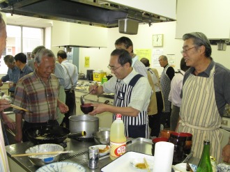 イヤ〜食った、食った、飲んだ、美味かった。満足、満足!!! 魚を捌くグループ、野菜を刻むグループ、天麩羅を用意するグループ、干物を焼くグループ等々、誰に指示・仕切られる事なく自然発生的に役割分担され、全員参加で料理作りに没頭していた。