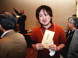 | グローブライド(株)の嘉山さん(53年卒)による講演 | 横田さん(38年卒)による乾杯 | |||